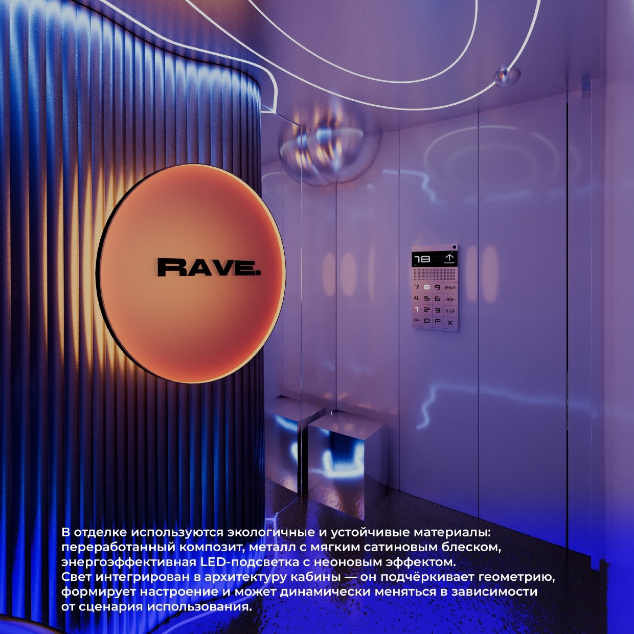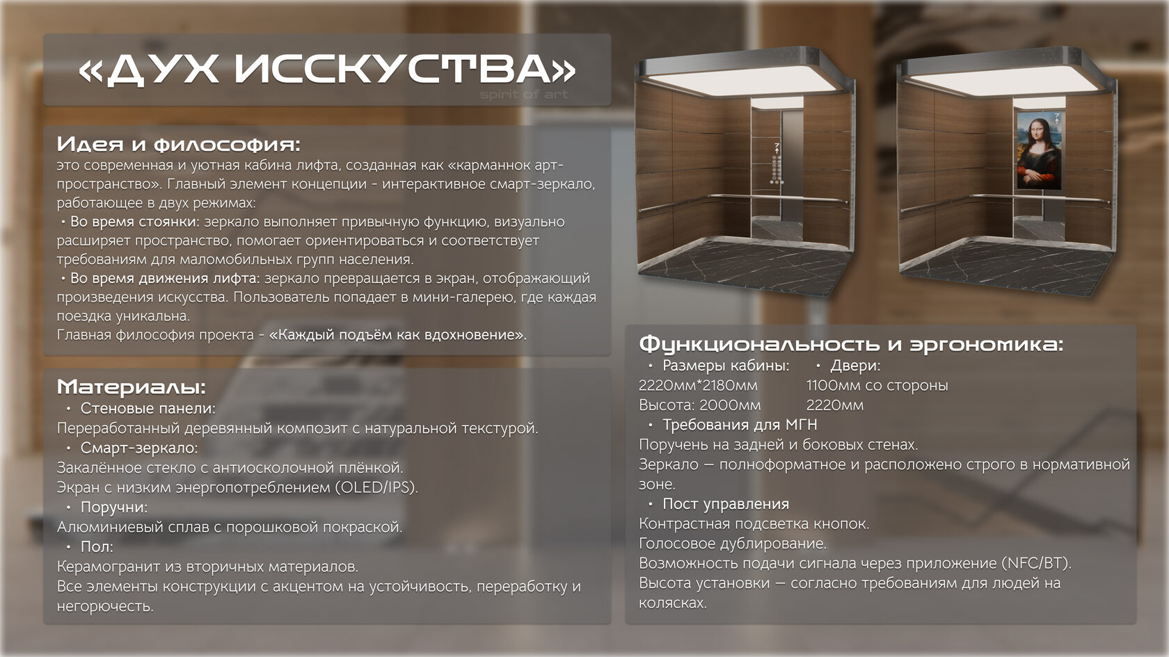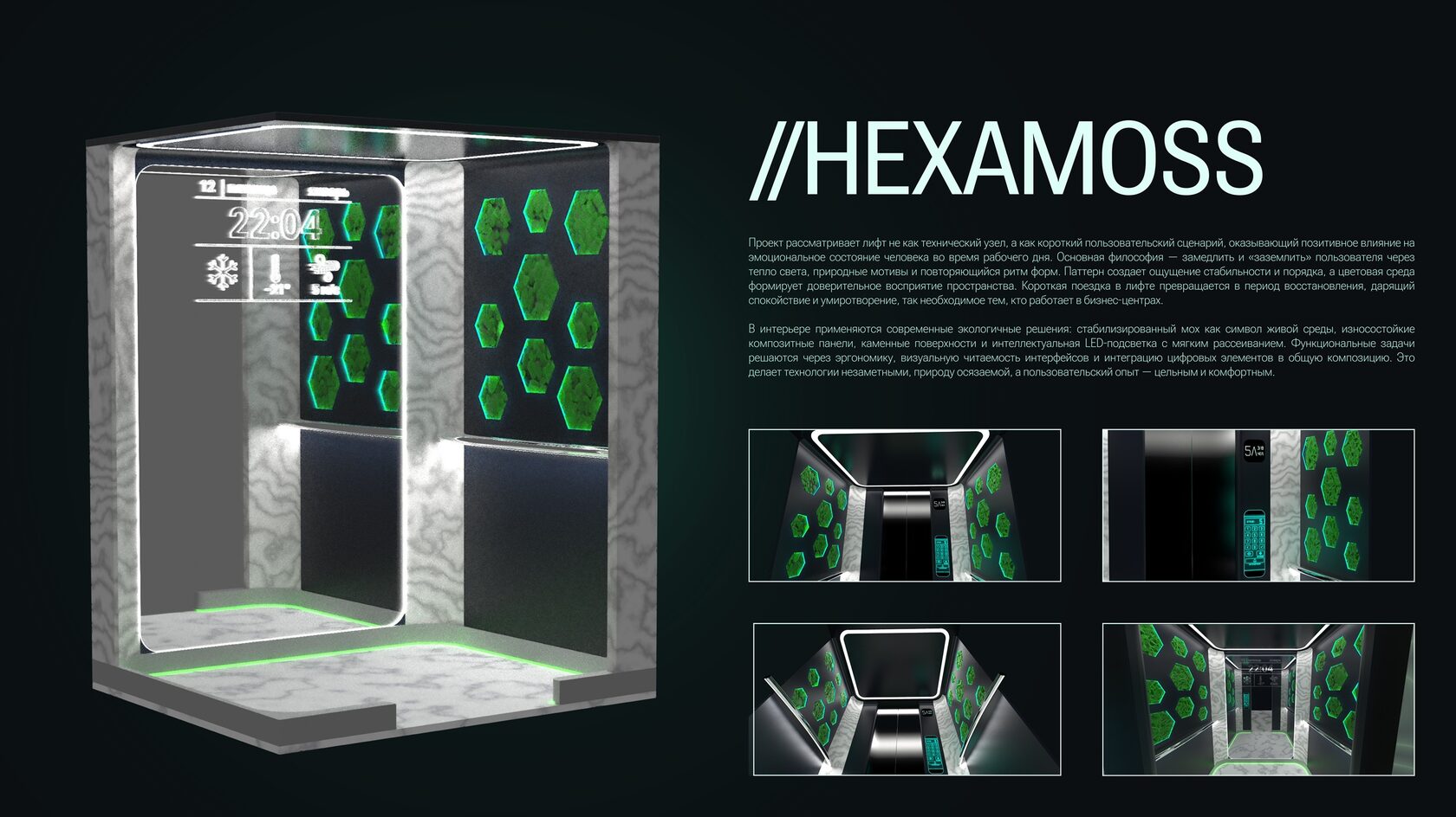 Итог: Ваша работа должна представить не просто лифтовую кабину, а комфортное, умное и ответственное пространство будущего, отвечающее самым актуальным запросам пользователей и планеты.