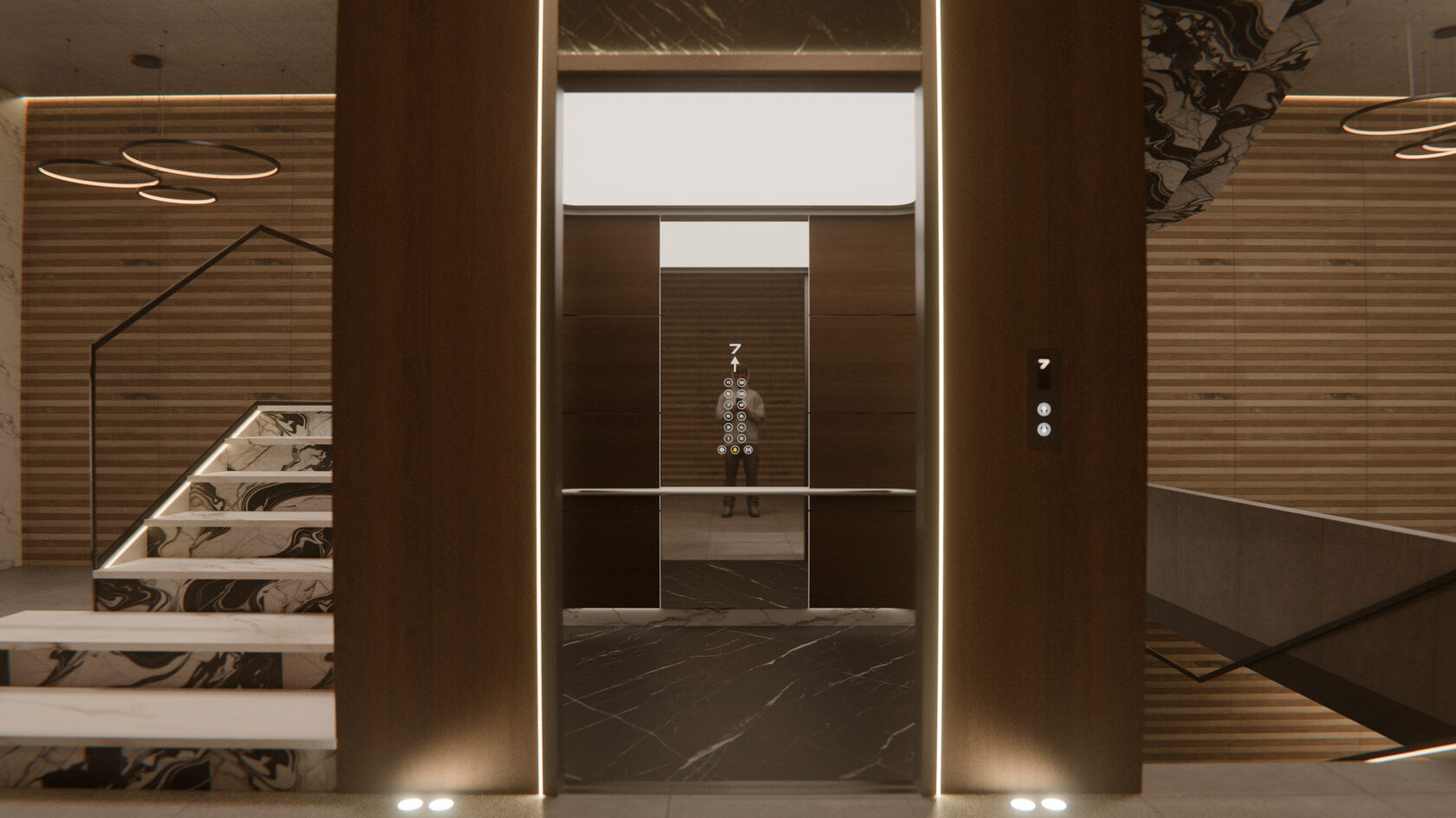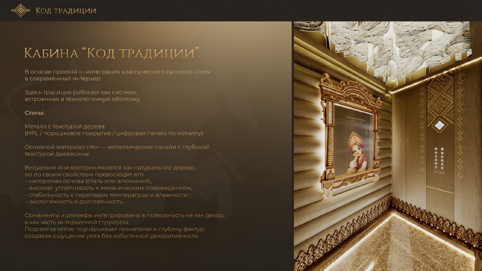 Ваша цель: Разработать инновационный дизайн кабины лифта, который гармонично сочетает в себе: