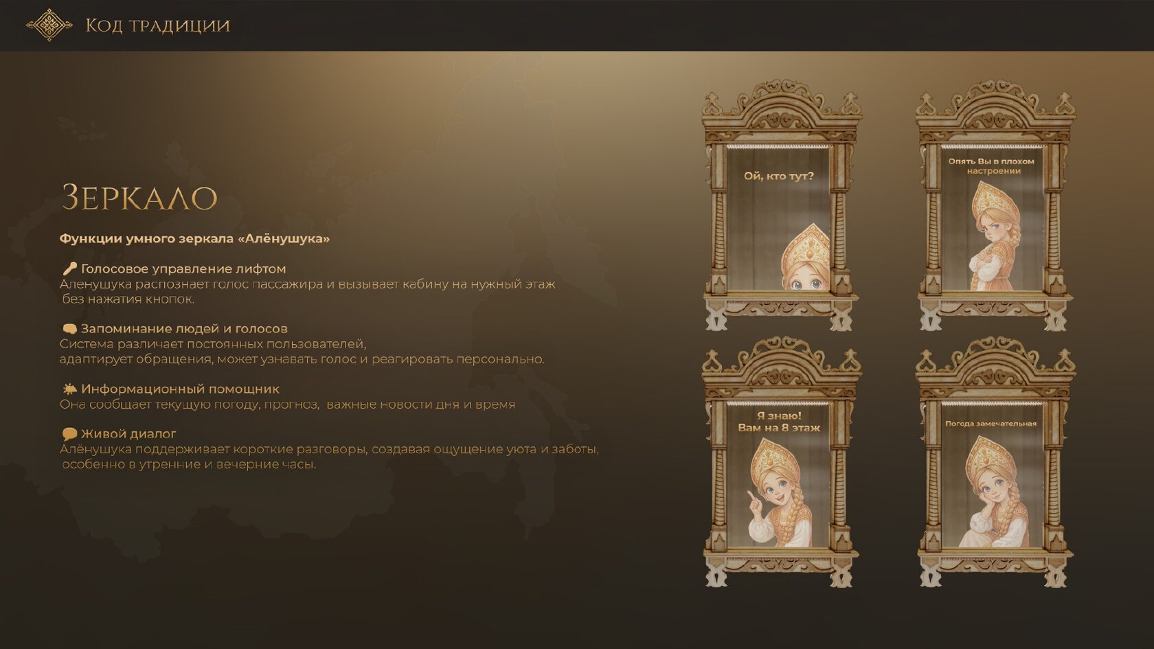 Интеграция Технологий: Умное управление (кнопки, сенсоры, голос,приложение), интерактивные поверхности, адаптивное освещение, информационные дисплеи, системы безопасности и мониторинга.